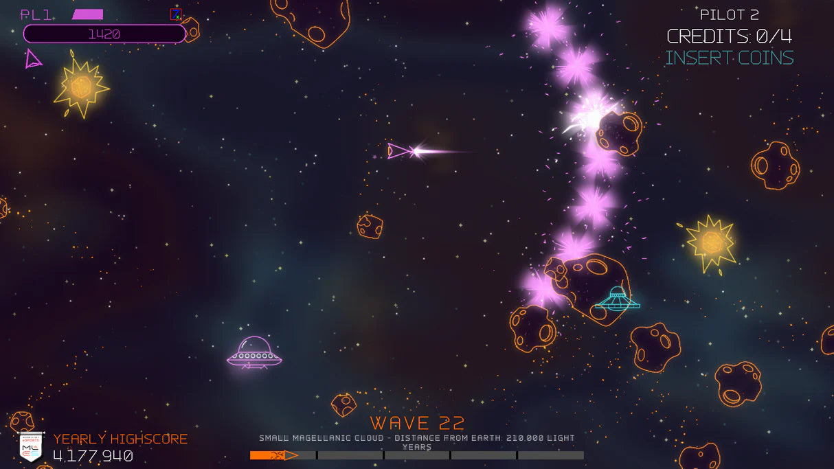 - Redesigned gameplay: This version of Asteroids Recharged is the most intense one yet. Space battles happen across 256 waves, with challenges added throughout